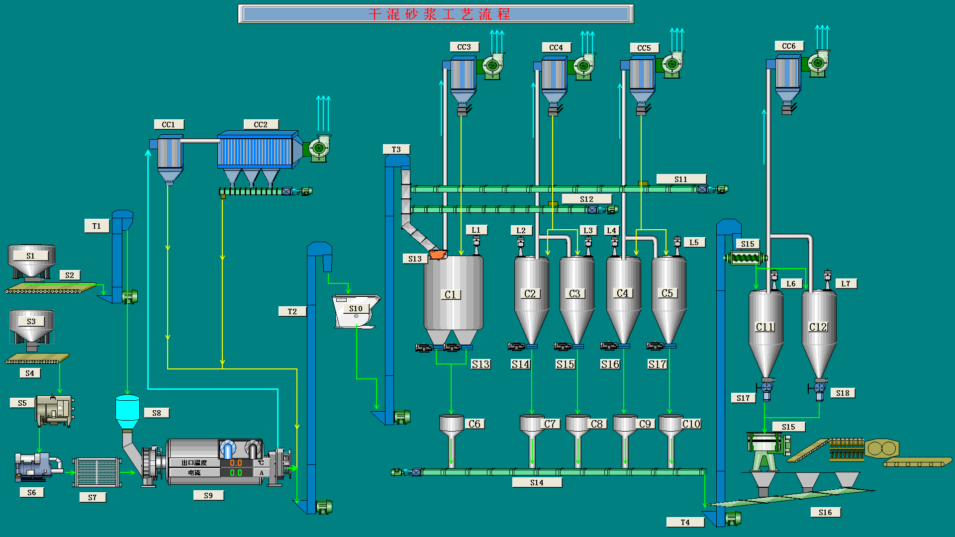 一條生產(chǎn)線可生產(chǎn)多個品種,可生產(chǎn)干混內(nèi)墻砌筑砂漿、干混內(nèi)墻抹灰砂漿、干混外墻抹灰砂漿、干混?;⒅檩p質(zhì)砂漿等產(chǎn)品。